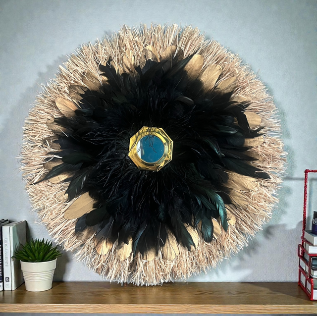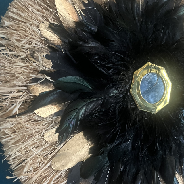 Ce jujuhat, réalisé à la main, est une pièce unique qui apportera une touche d'originalité à votre espace. Il est orné de raphia, de plumes d'oie ainsi que de plumes de dinde.