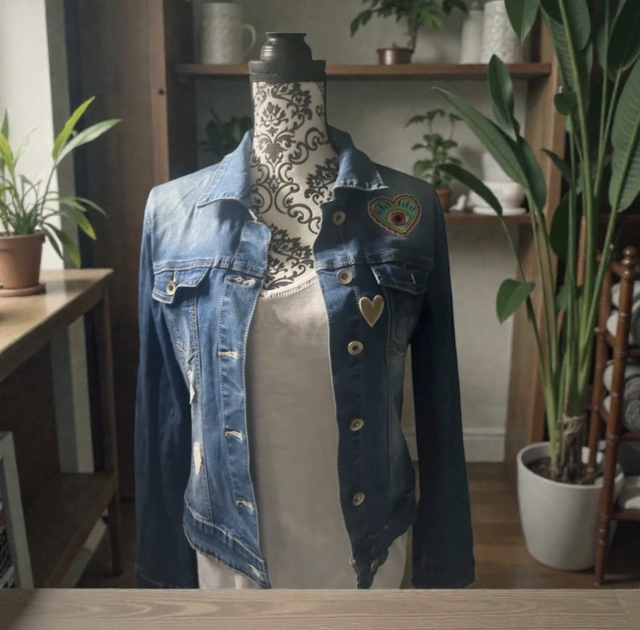 Osez l’originalité avec cette veste en jeans Upcyclée, chinée, lavée et customisée.